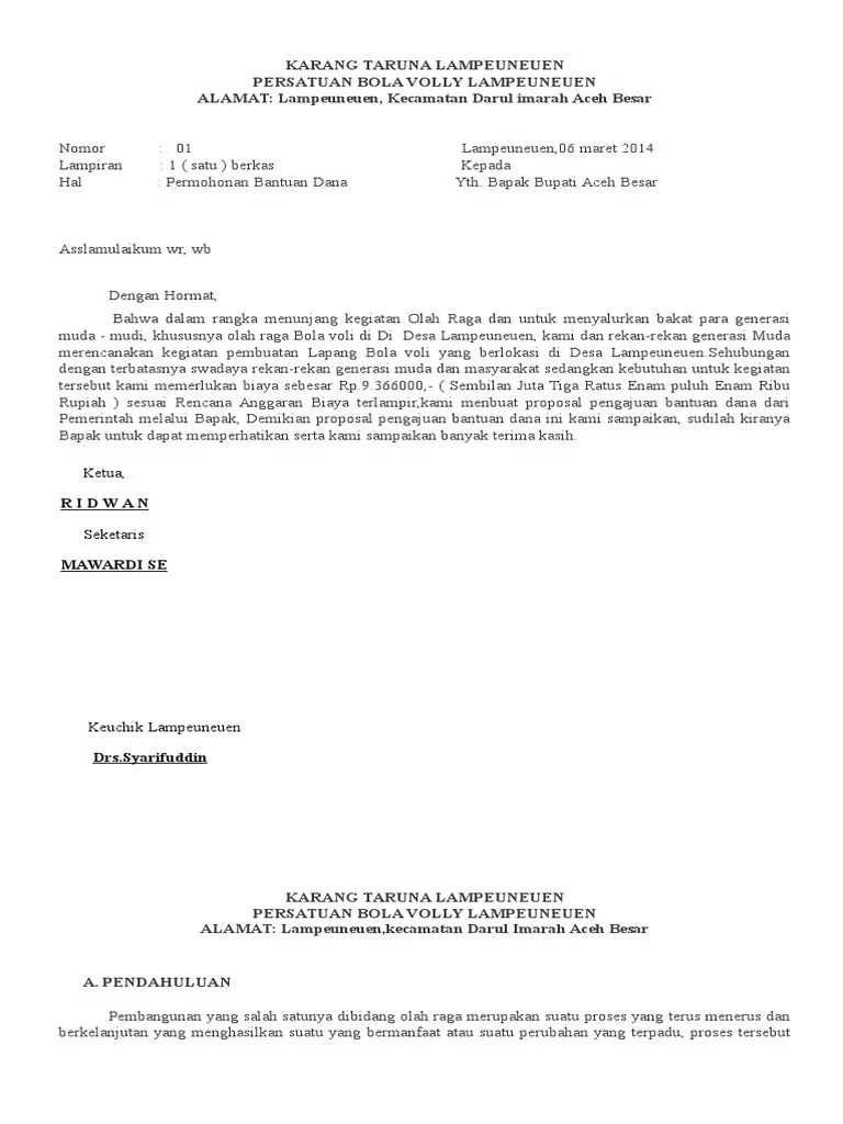 Audit contoh proposal pengajuan dana olahraga contoh proposal.com. Contoh proposal bola voli terbaru. Rab pengajuan lapangan bola volideskripsi lengkap. Permohonan bantuan dana di turnamen bola voli kabupaten tempat assalaamualaikum wrwb. Merpati jeumpa gampong pulo siron kecamatan kuta blang kabupaten bireuen Demikian proposal bantuan dana pembangunan lapangan voli ini kami. Menyampaikan permohonan proposal pengajuan bantuan sarana dan prasaran lapangan bola voli sebagai bahan pertimbangan. Terciptanya kesatuan dan persatuan generasi. Lapang bola voli merupakan sarana yang vital untuk kegiatan kemasyarakatan khususnya dibidang olah raga yang dapat menunjang kegiatanyang positif dan . Sep 4, 2019 — proposal pengadaan sarana prasarana olahraga proposal permohonan bantuan dana untuk pengadaan saran dan prasarana olah raga di mts . Proposal pengajuan lapangan bola volifull description. Sedangkan fasilitas olah raga tersebut terasa sangat kurang, khususnya fasilitas bagi team sepakbola dan team bola volly karang taruna. Kami dan rekan rekan generasi muda mengajukan permohonan bantuan peralatan olah raga bola voli yang berlokasi di.